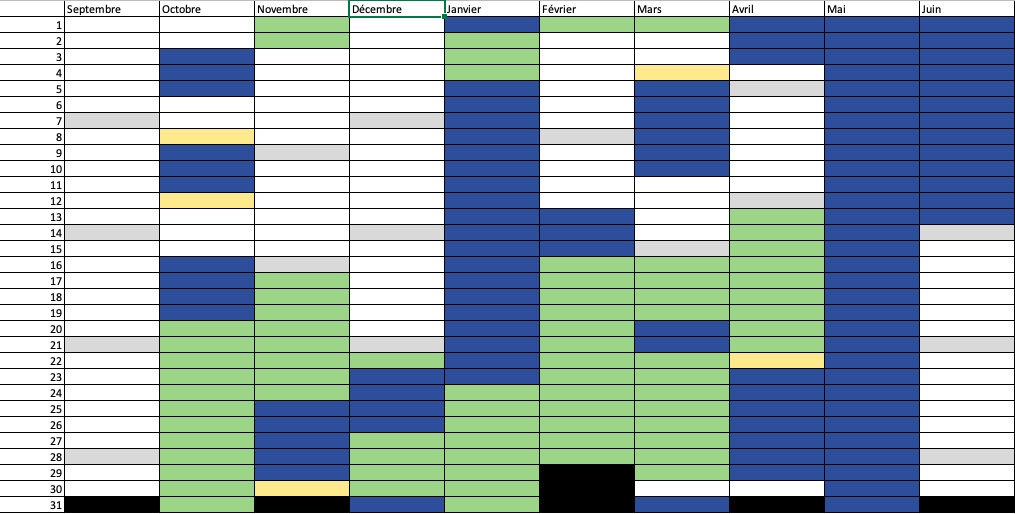 Blanc : possibilité de rencontre. Bleu : indisponibilité totale. Vert : indisponibilité sauf pour nuit et plus suivant mon planning. Jaune : possibilité de soirée/nuit/24h à Paris.